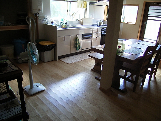大田市温泉津町 K邸 狭い台所を後の倉庫とつなげて広くする工事。使用した床材は、ナラ無垢フローリング。キッチンはタカラスタンダード”エーデル”