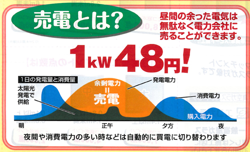 具体的な仕組みは、下の図にあるように、太陽光発電システムでは、太陽がでているお昼の時間帯に多くの電気を発電します。一方で、家庭で消費する電気はお昼よりも朝方や夜間に多く使われています。このギャップ部分の余った電気が電力会社に「売電」されるわけです。