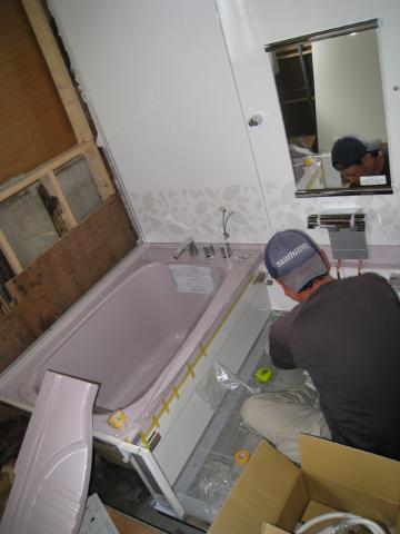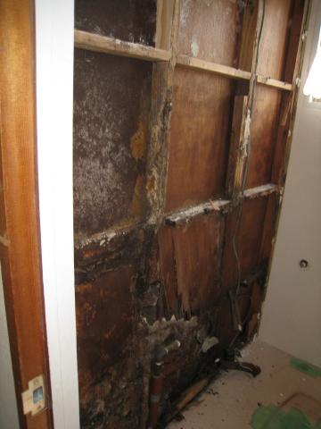 浴室を解体していくと、トイレ側の壁が腐っている事が判明しました。水もれと湿気が原因です。