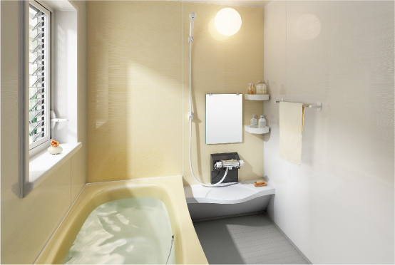 | 浴槽は、FRPアール浴槽フレッシュイエロー。壁パネルは、非塩ビ樹脂シートの「eパネル」を使用しています。床は、シャトルグレーを使用。 | |||||||||||||