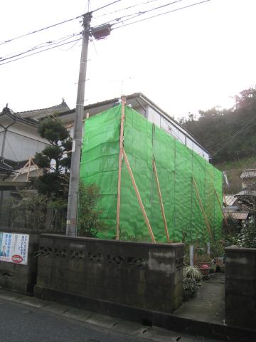 足場を組んで、ネットをかけて工事します。