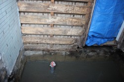 土間・壁にひび割れが見られ、土間に水が漏れている様子でした。