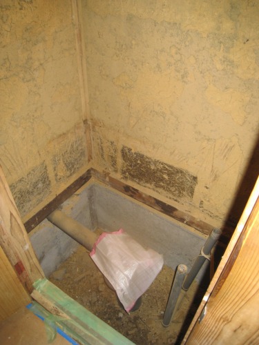 タイルの床を土の見える状態まで解体して施工していきます。