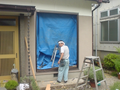 玄関引き戸の取替が終わり、縁側のサッシを取替手いるところ