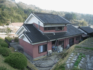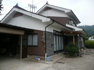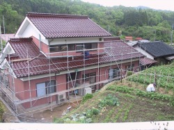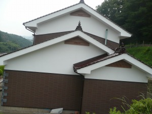 | 筑後30年の建物です。瓦がかなりいたんでおり、時々雨漏りがするので今回屋根替えをする事になりました。 | 外壁も現在ベニヤの外装材の痛みがひどくところどころめくりあがっており、妻の漆喰壁もはげていたので、今回大幅にやりかえる子Tになりました。 |