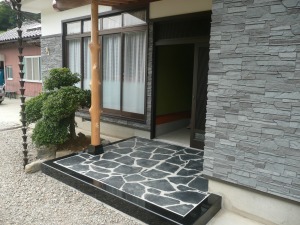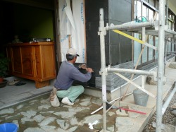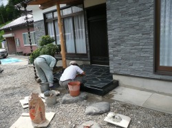 | 玄関のポーチに鉄平石を張っているところです。 | 玄関に高級タイルサイディングを張っているところです。 | ||||