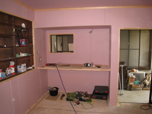 床材の施工が終わり、珪藻土を塗るために、ボード貼りをしています