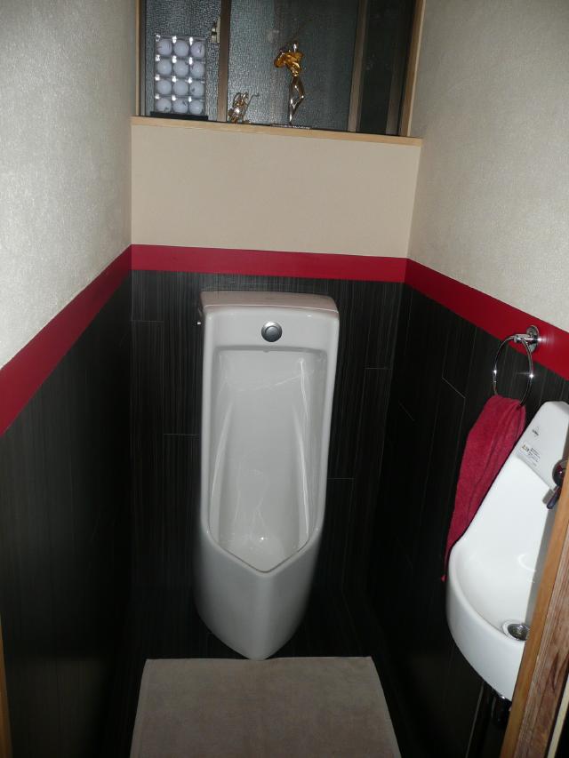 | ↑男性用トイレ。腰壁までは施主様こだわりの黒。 ↑女性用トイレ。TOTOです。 | ||||||||
