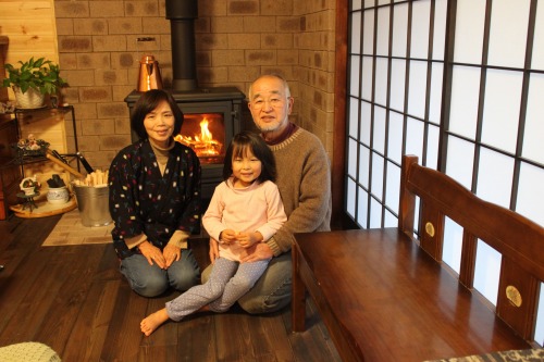 お孫さんと一緒に暖炉の前で記念撮影