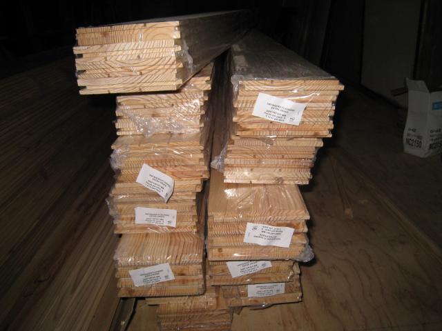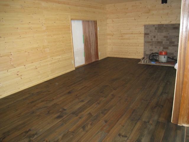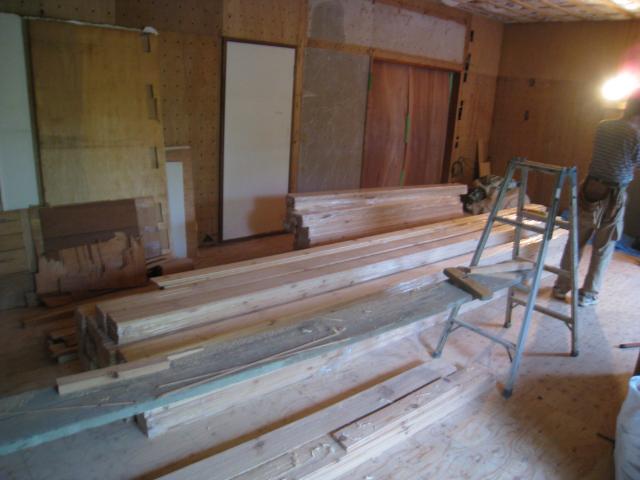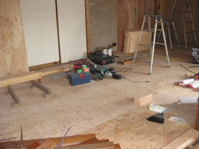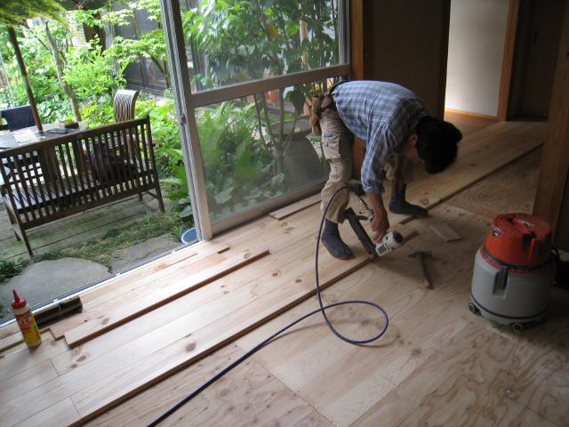 廊下と部屋の床は、松のフローリングを貼っていきます。