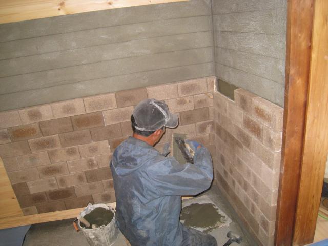 薪ストーブを置くために、レンガをつんでいきます。