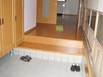 | 工事が始まる前にH様と記念撮影をしました。 | 施工前は土間になっていたところを解体します。 | 施工前の玄関まわりは、段差が急で危険でした。 |