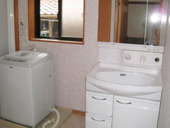 | キッチンまわりはフローリングにして、タカラのエーデルを使用しました。 | 洗面所はタカラのオンディーヌを使用しました。 |
