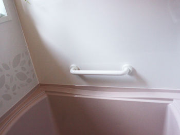 | 完成しました。使用したシステムバスは、タカラスタンダードのミーナP1216タイプです。 | 手すりを付けたバリアフリー構造です。使いやすさが増しました。 |