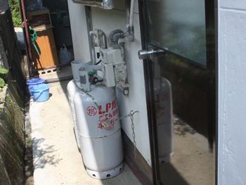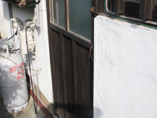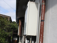 | 施工前のお風呂は、40年以上使われていました。 | 脱衣所の扉の段差が気になります。 | 施工前の給湯器です。自動タイプに変更します。 |