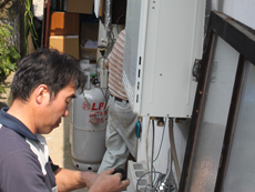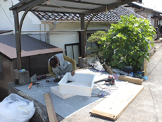 | 施工中の様子です。コンクリートを流し込んでいます。 | 骨組みを作っています。 | 新しい給湯器を取り付けています。 |