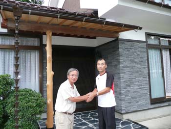 | 完成しました。工事が終わった外観を浦の山から俯瞰した様子です。 | ご主人のK様と完成の握手をしました。 |