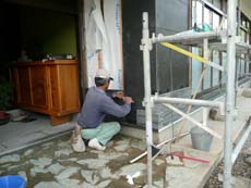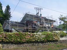 | 既存の瓦を撤去いたします。 | 外壁に新しいサイディングを張っていきました。 | 玄関のポーチに鉄平石を設置します。 |