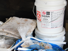 | 高圧洗浄工事中です。 | 遮熱・断熱・防音・消臭・結露等様々な効果があるガイナ塗料を使用します。 | 塗装工事中の様子です。 |