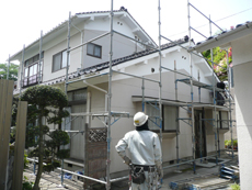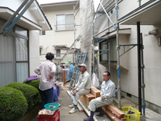 | 足場の組み立てから始めます。 | 既存の屋根瓦を撤去いたします。 | 休憩中に奥様とお話させていただきました。 |