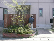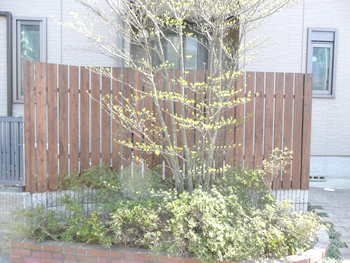 | 施工が完了しました。綺麗なウッドフェンスに変わった事で植物もイキイキしている様に見えます。 | こちらは玄関ドアから見た様子です。 |