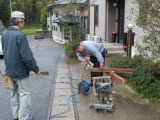 | 施工を行う前に、商材をカットします。 | 枕木を撤去してリブブロックを施工しました。 | 商材のカットが終わり、柱を設置します。 |