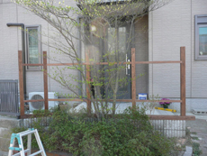 | フェンスの土台を施工している様子です。 | キシラデコール塗装した桧の柱を施工しました。 | 正面から見た様子です。横の柱も施工しました。 |