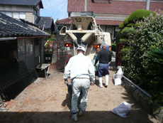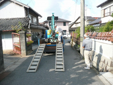 | 機材を慎重に運び込みます。 | 施工を行う前に、古いコンクリートを撤去します。 | コンクリートが撤去され、下層にあった土が出てきました。 |