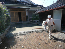 | 新しいコンクリートを運び込みます。 | 整地をして鉄筋をしきこみます。 | 日差しの強い中の作業は、ベテランの職人でも大変です。 |